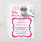 Invités Invitations avec cette invitation baby shower personnalisable. Il présente une jolie illustration rétro d'une chouette tanné brillante aux couleurs vives, bleu, jaune et rouge-orange et rose chaud et aux motifs floraux. Cette invitation à la chouette est parfaite pour un baby shower ludique, lumineux et girly. Personnalisez en ajoutant les détails de votre événement.