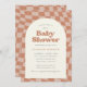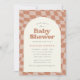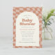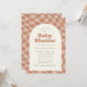Une invitation baby shower inspirée par les années 70 design rétro. Cette carte est dotée d'un motif de damier brun neutre qui donne un aspect super - parfait pour un baby shower super ! Le mot "baby shower" est dans une police rétro pour compléter le look.
