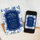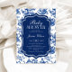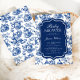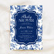 Tea party baby shower bleu chinoiserie invitation. Bel design élégant en bleu marine et blanc avec des accents botaniques peints à la main et des théières. Vous pouvez choisir des invitations imprimées et/ou le modèle numérique de téléchargement instantané. Idéal pour un baby shower de thé élégant.