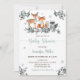 Cette adorable invitation présente des animaux de bois dans la neige avec une bordure de pin verdoyant.