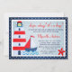 Jolie invitation baby shower pour les garçons ayant pour thème la voile. un pois motif blanc et bleu profond sur l'arrière - plan; Illustré par un voilier, une étoile de mer et un phare. Écrit "les navires en paix ! c'est un garçon !". Quelques éléments de Baby Star Design.