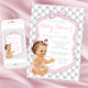 Diamants et perle baby shower invitation avec adorable petite fille en pantalon rose rouffle et fil de perles sur un beau tufted arrière - plan en diamant avec joli argent et l'arrière - plan arc rose. Cette adorable invitation aux diamants roses et gris et aux baby showers perles est facilement customisée pour votre événement en ajoutant simplement vos détails dans le style de police et le libellé de votre choix. Il s'agit d'un design imprimé sans vrais diamants, perles, tufting, parties scintillant, etc.