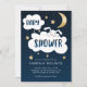 Carte d'invitation baby shower douce pour votre lune et la fête à thème des étoiles! Illustration de nuages avec un lapin qui regarde sa tête de l'un d'eux. Il y a des textes dans les nuages qui disent "baby shower". Il y a la lune brillante or et les étoiles sur un arrière - plan bleu marine foncé. Les informations du baby shower partie sont les suivantes. Les textes sont facilement personnalisables en ligne. Cet invitation a été conçu pour une douche pour bébé garçon. Illustration et design par Namibear Art Studio. ©Namibear
