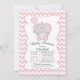Baby shower d'éléphant moderne avec un joli petit éléphant gris et rose tenant un ballon pour un baby shower de filles. Notre invitation d'éléphant contemporain est installé sur un arrière - plan de chevron rose et blanc rayé et a un dos assorti pour une touche spéciale supplémentaire. Parfait pour un safari dans la jungle, un zoo, un baby shower à thème pour éléphants pour une petite fille.
