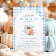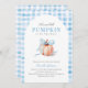 Célébrez votre bébé d'automne de la manière la plus charmante avec cette invitation de baby shower bleu en vichy. Doté d'un citrouille d'aquarelle douce attachée à un arc bleu pastel, ce design allie à merveille charme de chute rustique et élégance moderne. Que vous planifiez un rassemblement d'automne ou une fête saisonnière pour un bébé, cette invitation donne le ton parfait. Personnalisez les détails, envoyez-les à vos invités, et préparez-vous pour une douche inoubliable remplie d'amour, de rires, et un tas de vibes d'épices citrouilles!