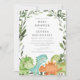 Invitation votre invité avec notre invitation à baby shower de dinosaures élégant et moderne comprend des guirlandes d'eucalyptus vertes et des dinosaures aquarelle. Personnalisez avec vos détails de baby shower dans une mise en page simple et élégante police de style manuscrite.