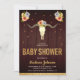 Éblouissez vos invités avec cette invitation de baby shower à thème tribal avec un crâne de vache fleuri contre un arrière - plan de grange rustique. Ajoutez simplement les détails de votre événement sur ce modèle facile à utiliser pour en faire une invitation unique. Retournez la carte pour révéler une fausse texture de parties scintillant d'or au dos de la carte.