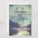 Laissez l'aventure commencer par thème baby shower aquarelle invitation avec forêt et lac de montagne, paysage sauvage, avec typographie de script de calligraphie. Ethérée et magique.