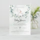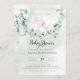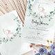 Un petit éléphant mignon sur une branche d'eucalyptus se balançant. Cette invitation baby shower présente des aquarelles dessinées à la main et des polices modernes.