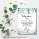 Pour un baby shower, célébrer une petite fille. Un arrière - plan blanc. une adorable petite fille d'éléphant, une végétation d'eucalyptus et des étincelles vertes. Personnalisez et ajoutez le nom de la mère à être le nom et les détails de la fête. Le nom et le texte : Baby shower sont écrits avec un script de style écrit à la main
