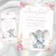 Petite fille éléphant invitation douche bébé avec adorable éléphant aquarelle avec de jolies fleurs roses sur la tête sur un joli arrière - plan rose floral. Ces invitations mignonnes à la douche bébé pour éléphant sont facilement customisées pour votre événement en ajoutant simplement vos détails.