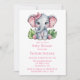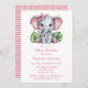 Un joli dessin animé d'un bébé éléphant aux grands yeux bleus expressifs et aux joues roses roses. L'éléphant possède de grandes oreilles disquettes décorées de pois blancs et d'un arc en pois rose sur le dessus. Le tronc de l'éléphant est courbé vers le haut dans une expression joyeuse, et ses pieds sont peints en rose avec de petits ongles d'orteils. L'éléphant est assis devant deux grands feuilles de la monstère verte. L'oeuvre a une finition douce et aquarelle avec des lignes épurées et un arrière - plan blanc. Le corps de l'éléphant est rendu dans le gris clair avec une ombre subtile et des reflets. La composition globale est d'une esthétique douce, de style pépinière, avec des couleurs rose et gris accentuées par le feuillage vert.
