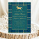Une invitation au baby shower classique et preppy avec des éléments équestres et plaid en vert marine et chasseur avec des accents de ton or. Une silhouette de cheval coureur orne le sommet et la motif tartane ajoute une touche intemporelle. Parfait pour un baby shower à thème Vieux Argent avec une atmosphère classique, vintage et luxueuse. Si vous aimez le noyau grand-père, le style vintage est un grand invitation baby shower. Disponible en version imprimée et en téléchargement numérique. Customisez ce modèle d'invitation de baby shower modifiable avec vos propres détails d'événement.