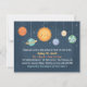 Une invitation à baby shower sur le thème de l'espace mignon avec des gribouillis du soleil et des planètes y compris la planète Terre avec des nuages comme sourcils. Un décor de petites étoiles sur un arrière - plan bleu foncé. Une façon merveilleuse d'accueillir le petit au monde ! Personnalisez avec vos détails de baby shower dans le texte modèles fournis.