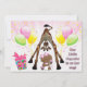 Invitations mignons de baby shower de fille d'Afro-américain. Amusement, girafe heureuse et lunatique de bande dessinée avec sa tête regardant vers le bas entre ses jambes un bébé assez ethnique tenant les petits gâteaux roses. À côté de eux est une boîte-cadeau colorée avec le ruban. L'arrière - plan est un beau rose lumineux et gai éclaté avec les ballons et les flammes colorés. Ces invitations élégantes et à la mode sont décorées les deux côtés. Invitations à la mode, girly, modernes pour les filles ethniques. NOTEZ SVP : Toutes les invitations sur Zazzle ont des images imprimées d'appartement. Le texte, la police et la couleur de la police sont personalizable/personnalisables sur le dos des invitations, texte sur l'avant est fixe. Si vous avez besoin d'aide customisant votre produit svp me contactez par mon magasin et je serai heureux d'aider. Quelques éléments achetés de resaleclipart.com.