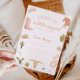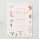 Carte d'invitation baby shower pour fille mignonne avec des illustrations de bottes de cowboy, cheval, serpent, crâne, cactus, casquettes de cowboy, etc. Le texte dit "selle up ! une petite cowgirl est en route"