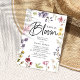 Baby in Bloom fleur sauvage Baby shower Invitation. Ce design adorable présente un arrière - plan blanc classique décoré de fleurs sauvages aquarelles peints à la main et encadrant une élégante modèle. Au verso se trouve un beau motif fleur sauvage.