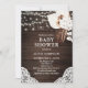 L'invitation au baby shower boho rustique présente des fleurs beiges et blanches et des feuilles de palmiers séchés sur un arrière - plan en bois.