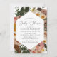 Élégante invitation à la douche bébé d'automne avec vos détails de baby shower niché dans un cadre géométrique entouré de fleurs d'aquarelle et de verdure dans les couleurs automnales muettes d'ivoire, orange, or moutarde, vert olive, rose poussiéreux, et marron. Les invitations à la douche à bébé florale d'automne s'inversent pour montrer un riche arrière - plan d'aquarelle vert olive. Conçu pour coordonner avec notre collection Boho Autumn Floral.