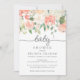 Belle et délicate invitation au baby shower avec roses pastel peints à l'aquarelle, hydrangées et pivoines dans les pêches et la crème, agrémentée de feuilles verts à l'eucalyptus. Personnalisez facilement cette élégante invitation avec vos détails de baby shower.
