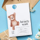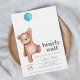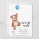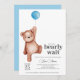 Une invitation baby shower "on peut attendre longtemps" avec un ours en peluche et un ballon bleu pour un bébé garçon. Objets correspondants disponibles dans la collection Thème du Baby shower de l'ours en peluche.
