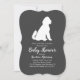 Inclure le grand frère ou la soeur bébé à fourrure dans la célébration avec cette adorable conception de baby shower de chien Goldendoodle! Parfait pour un amoureux du chiot avec un bébé en route. Le Golden doodle est à côté d'un adorable chariot vintage. L'arrière - plan gris damier est parfait pour une douche neutre ou co-ed pour les hommes !