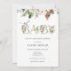 Baby shower invitation avec "oh bébé" en lettres d'or élégantes avec une bordure de à feuillage persistant et de pinecones. Parfait pour un bébé d'hiver. Customisez avec vos informations.