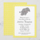 Une invitation orientée neutre de baby shower de genre, comportant une illustration grise mignonne d'éléphant sur un arrière - plan jaune de point de polka. Griffonnages de Scrappin de © de graphiques chez www.scrappindoodles.com