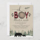 Une invitation au baby shower à thème hivernal avec silhouettes d'ours, pins, neige, papier imitation Kraft et flanelle de motif de plaid de buffles. Le même design est également disponible avec le mot bébé au lieu de garçon.