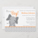 Une invitation orientée moderne de baby shower d'éléphant gris et orange. Perfectionnez pour un baby shower de petit garçon.