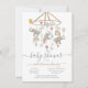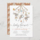 Invitations modernes et mignonnes Boho Baby Shower. Grande sensation scandinave avec Eléphants, arcs-en-ciel, ballons, pompons, nuages et étoiles, tous accrochés sur un mobile. Modèle de couleur neutre pour un garçon ou une fille à être. Terra cotta, gris bleu poussiéreux, tan et blanc.