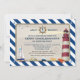 les baby showers Nautique-orientés sont une manière d'amusement de célébrer la future mère. Cette invitation comporte un arrière - plan barré de bleu marine accentué avec de petites icônes d'ancre. L'image principale est entourée par une frontière de corde avec un arrière - plan texturisé arénacé. Un phare brille sa balise à travers le texte. La roue d'un bateau est le point focal au dessus mais elle encercle la tétine d'un bébé. D'autres images incluent un voilier, des poissons, un télescope, un homard et un casquette d'un capitaine. Disponible avec les produits assortis.