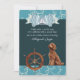 "Un petit marin est en route, fêtons-nous avec une journée spéciale !" Cette adorable invitation de baby shower nautique présente un joli Goldendoodle brun, roue de navire, détails de bulle d'eau tourbillonnante, et bannière de cravate bleue. Parfait pour fêter un bébé en route !