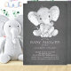Invitation de baby shower éléphant avec une girafe en niveaux de gris et de bébé sur un arrière - plan populaire en tableau noir pour un baby shower neutre pour le genre. Retournez notre invitation pour voir un arrière - plan gris coordonné pour une touche spéciale supplémentaire. Visitez notre boutique pour voir les articles correspondants.