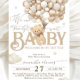 L'invitation présente un design délicieux et neutre qui combine le charme d'un ours en peluche à l'excitation des ballons. L'esthétique générale est douce et adorable, créant une atmosphère chaleureuse et accueillante pour le baby shower à venir. Le titre, écrit dans une police ludique et fantaisiste, dit : "We Can Bearly Wait" Le style de police reflète la joie et l'anticipation entourant l'événement, évoquant un sentiment d'émerveillement enfantin. Pour renforcer encore le thème de la neutralité des sexes, l'invitation évite l'utilisation de couleurs spécifiques associées aux rôles traditionnels des sexes. Au lieu de cela, il adopte des tons bruns doux et neutres, favorisant un environnement inclusif et accueillant pour tous les clients. Le design rayonne de chaleur, de joie et d'anticipation, invitant les invités à se joindre à la célébration de l'arrivée prochaine d'un petit précieux.