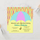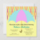 Cette invitation baby shower présente un thème neutre pour les femmes, avec un large parapluie turquoise et violet et des rayures verticales en pointillés au-dessus du parapluie. La couleur arrière - plan est jaune mais peut être modifiée en choisissant le bouton customiser puis en modifiant. Le texte personnalisé vous permet d'insérer vos propres informations sur la douche.