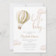 Cette charmante invitation au baby shower comporte une jolie montgolfière et des nuages, ainsi qu'une élégante typographie de script. Avec votre code QR de registre et photo spéciale au verso. Conçu par Thisisnotme©