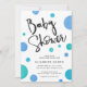 Invitations de douche pour bébé Polka Dot avec "Baby shower" en écriture manuscrite amicale et de grands pois bleu et aqua flottant dans un design très moderne et à la mode. Des invitations parfaites pour des baby showers garçons modernes et amusants.