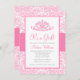 Fancy damask princess thème des invitations à la douche bébé. Doté d'une jolie illustration de couronne avec un motif damassé rose et blanc. Personnalisez facilement votre fête !