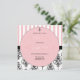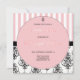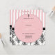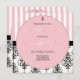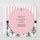 Cette belle invitation élégante de baby shower incitera n'importe quelle mère pour être special de sensation ! Grand cadre central de cirlce dans les points noirs minuscules, accentués avec un élément de damassé de vinatge pour que vous personnalisiez avec toute les information pour votre partie ou douche. La moitié supérieure a un arrière - plan de blanc et les rayures roses et le fond a une damassé noire et blanche élégante. Avant et dos polychromes d'impression. Approprié à l'anniversaire de dames ou de filles, changement nuptiale ou de wedding shower ou de baby shower simplement le texte d'invitation pour votre événement.