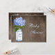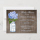 Les invitations rustiques élégantes de baby shower de pays pour des garçons avec un pot de maçon en verre bleu et blanc mignon et une illustration vintage de fleur d'hortensia assez bleu sur un chêne brun foncé chic minable élégant ont effacé l'arrière - plan en bois patiné d'effet de grain. Invitations modernes chics, à la mode, à la mode parfaits pour le ressort, été, chute/automne et douches d'hiver. Tout les texte peut être facilement customisé pour répondre à vos besoins et vous pouvez changer le style de police, la couleur et la taille de la police si vous désirez. Si vous avez besoin de n'importe quelle aide customisant votre produit svp me contactez par mon magasin et je serai heureux d'aider. NOTEZ SVP : Tous les invitations sur Zazzle ont des images imprimées d'appartement.