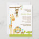 Jolie invitation baby shower avec girafe, lion, tortue, alligator et singe accroché à une branche.