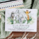 Boy Safari baby shower invitation avec animaux de la jungle, éléphant, girafe, et zèbre. Le dos de l'invitation a un motif rayé coloré.