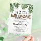 Invitations de douches pour bébé Wild one avec un simple arrière - plan blanc, parties scintillant verte, feuilles de palmiers tropicaux, le dicton "un peu sauvage est en route" dans différents posters de animaux, et un modèle de fête facile à personnaliser.