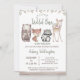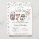 Cute Wild One Woodland Animals Baby shower Invitation Sweet woodland thème wild one est sur le chemin baby shower invitation avec cinq animaux de bois mignons illustrations dans des tons principalement naturels et certains feuillage et le bois comme image. Cette invitation au baby shower de bois comporte également une petite branche de division et est idéale pour un baby shower neutre sur le thème des bois.