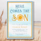 Famille d'Invitations et amis à votre baby shower sur le thème du soleil avec cette invitation de baby shower garçon élégant. Il présente le texte "Here Comes The Son" en typographie rétro avec un soleil d'aquarelle jaune sur un arrière - plan bleu ciel. Facile à personnaliser. Utilisez l'outil de conception pour modifier la taille, le style ou la couleur du texte. Parce que nous créons notre oeuvre, vous ne trouverez pas cette image exacte d'autres designers. Aquarelle originale © Michele Davies.