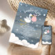 Une invitation baby shower avec une aquarelle bleu foncé inspirée de l'arrière - plan avec texte blanc entouré d'étoiles et illustrations de nuages blancs et une cigogne avec bundle rose. Personnalisez avec les détails de votre occasion.