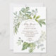 Belle invitation de baby shower au thème de la forêt peinte à l'aquarelle et neutre. Retournez notre doux design pour voir un dos coordonné avec des feuilles vertes pour un effet spécial.