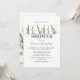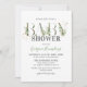 Elégante invitation de baby shower botanique naturel avec un arrière - plan blanc élégant qui peut être changé à n'importe quelle couleur, belle aquarelle rustique vert feuillage, accents de parties scintillant or, et un couple baby shower de célébration modèle qui est facile à personnaliser.