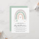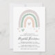 Jolie invitation de baby shower virtuel sans sexe avec une aquarelle boho d'un arc-en-ciel vert sauge, orange et lavande avec des coeurs, le nom de la mère dans un script élégant et les détails de la douche dans une simple typographie.